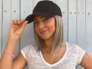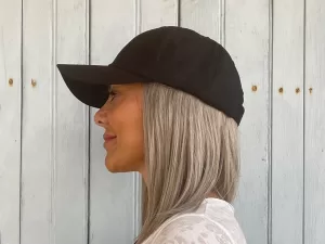 Beautiful silver ash blonde choppy bob attached to a black baseball cap.