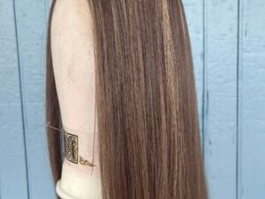 100% Remy virgin human hair, silk top, 130% density, Small Cap size with adjustable straps and clips. 10″ At the front, mushroom brown, ash tones STUNNING!